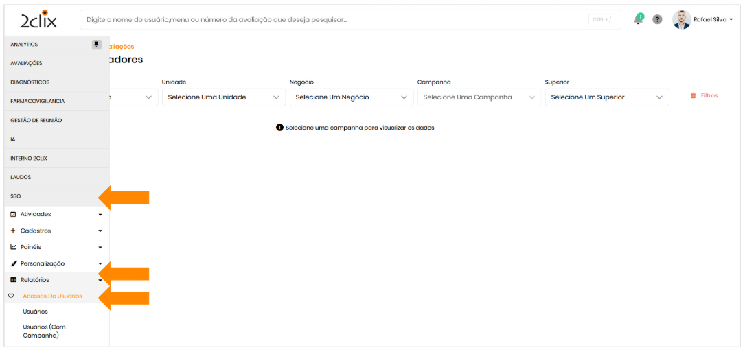 No menu lateral esquerdo, acesse: SSO > Relatórios > Acessos de Usuários.