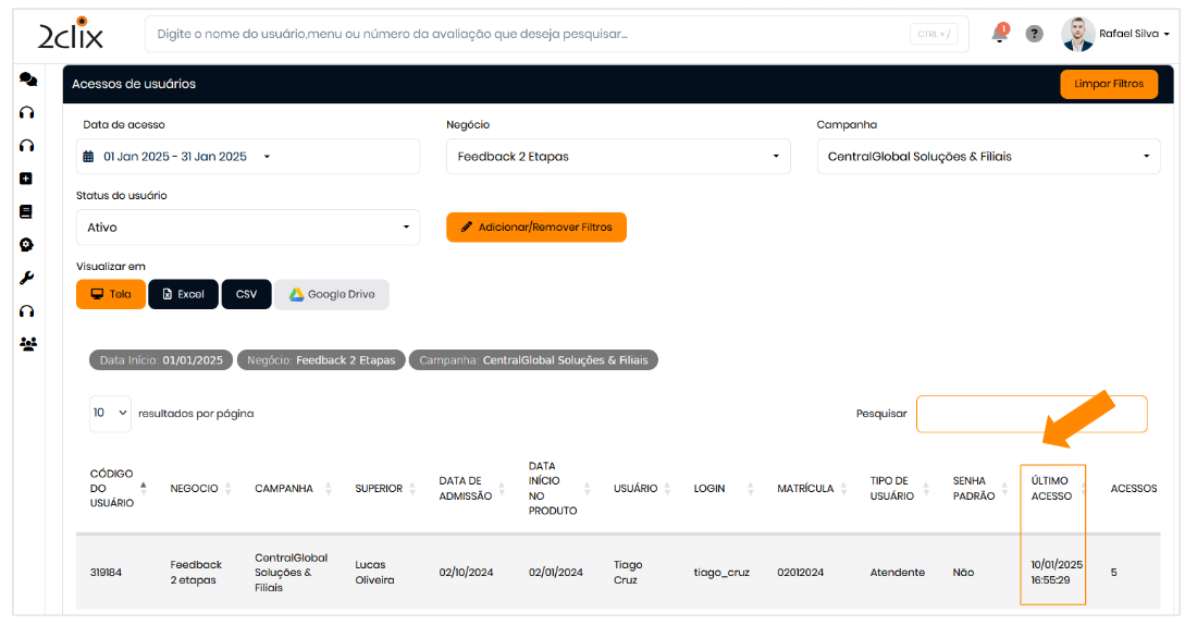 Na coluna "Último Acesso" , você encontrará os dados e a hora do último acesso do usuário à plataforma.