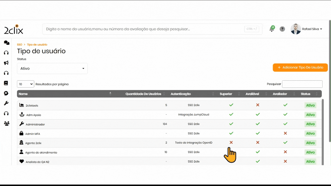 - Clique no tipo de usuário ao qual deseja habilitar ou verificar as permissões. Para este caso, selecione o perfil Administrador .