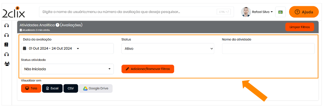 Utilize os filtros disponíveis para refinar sua busca. Esses filtros ajudam a encontrar atividades específicas de acordo com o período, responsável e status.