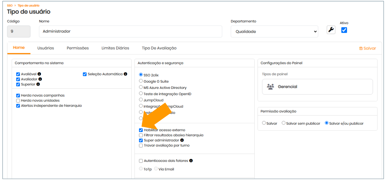 Configure a Permissão de Acesso Externo- No painel Autenticação e Segurança, localize a opção Habilitar Acesso Externo.
