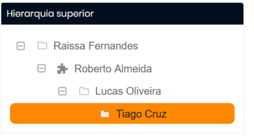Com essa configuração definida na plataforma, o Atendente Tiago Cruz tem como líder o Supervisor Lucas Oliveira , que, por sua vez, está subordinado ao Coordenador Roberto Almeida, e assim sucessivamente até a Gerente Raissa Fernandes.