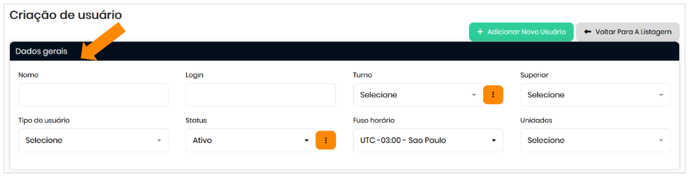 Dados Gerais: Contém os campos principais para identificar e configurar o acesso do usuário no sistema.