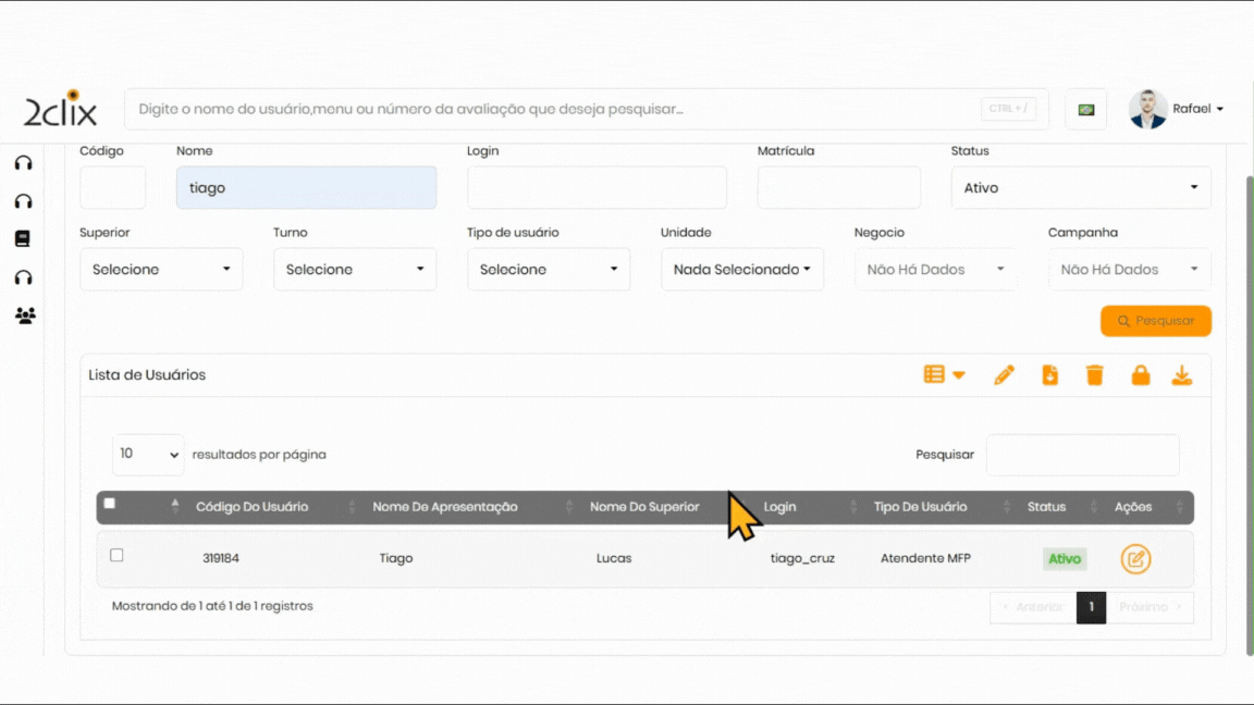 Utilize a barra de busca ou os filtros disponíveis para localizar o usuário que deseja editar.