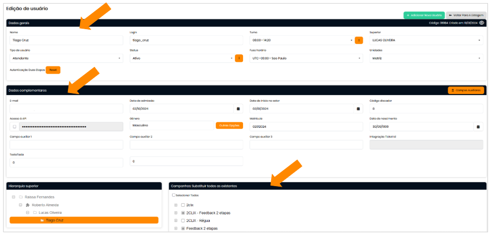 Durante o cadastro de um usuário, é possível definir quem será seu hierárquico superior , ou seja, quem estará acima dele na liderança. A plataforma permite que você atribua um Gerente , Coordenador ou outro Superior diretamente ao usuário. Isso facilita o gerenciamento e a comunicação dentro da organização, garantindo que os acessos e permissões sejam adequados à carga e às responsabilidades de cada pessoa.
