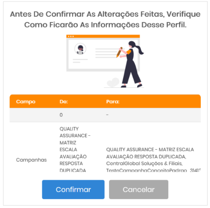 "Antes de confirmar as alterações feitas, verifique como ficarão as informações desse perfil."