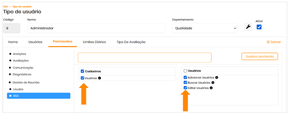 Para acessar as funcionalidades de cadastro e edição de usuários, é necessário que o usuário tenha a seguinte permissão habilitada: