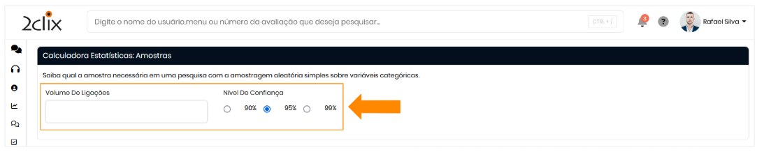 Exibe uma margem de erro e a quantidade de avaliações possíveis para atingir essa margem, considerando o volume de ligações e o nível de confiança selecionado.