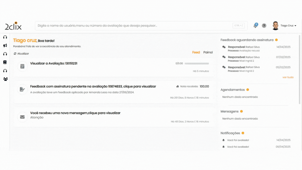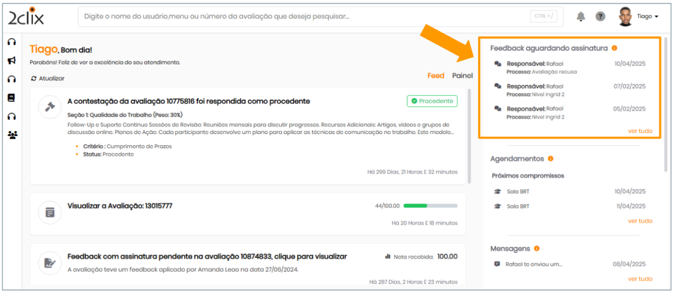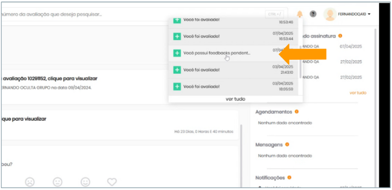 Exibe avaliações com feedback pendente em ordem cronológica decrescente (da mais recente para a mais antiga).