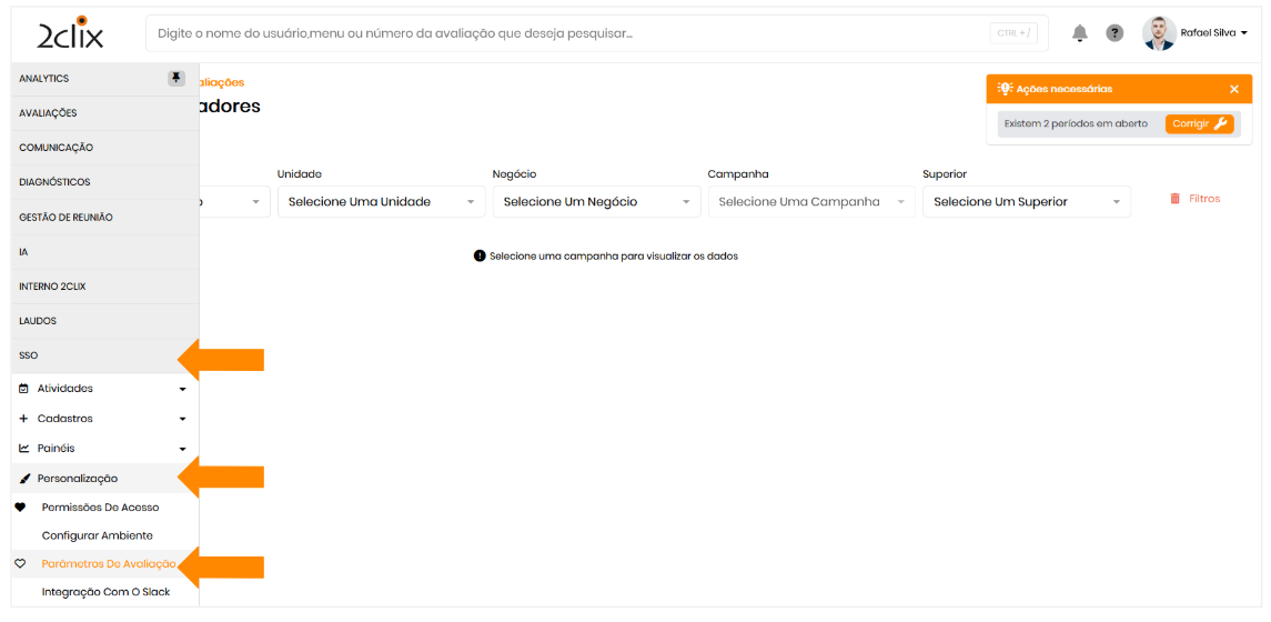 No menu principal da plataforma, clique em SSO>Personalização >Parâmetros de Avaliação.