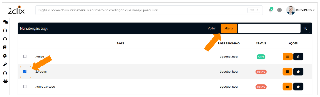 Ao selecionar uma tag, clique no botão Alterar para associar sinônimos à palavra-chave.