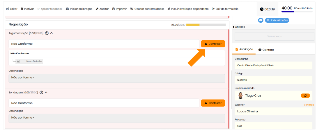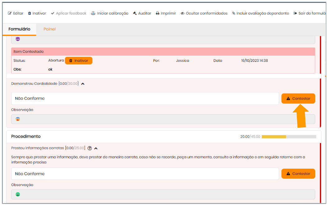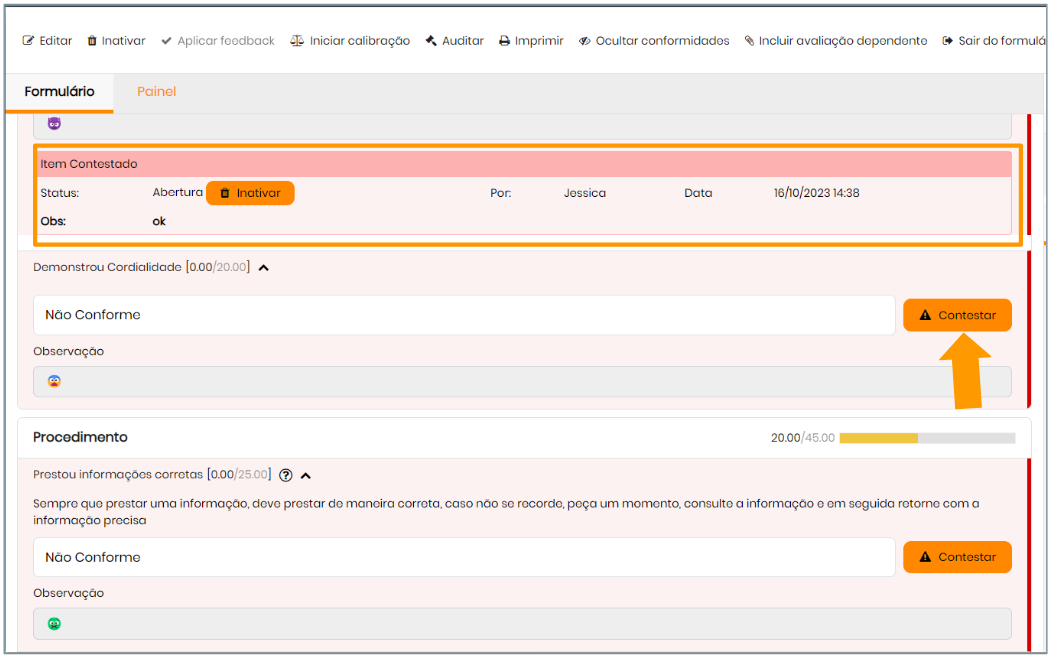 4. Conteste um item pontuado: Dentro da avaliação, identifique o item que deseja contestar e clique em Contestar.