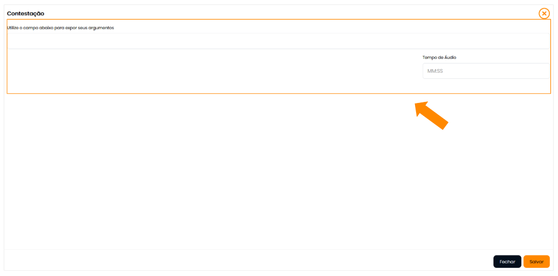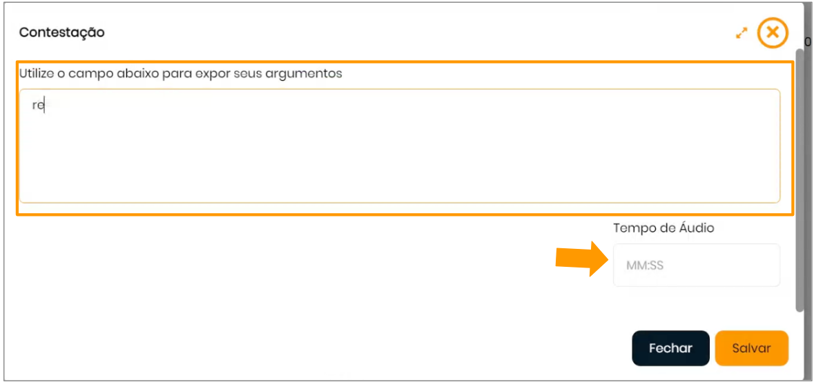 4. Abrirá de observação para preenchimento. Insira os seus argumentos do porquê está contestando. Se deseja incluir a minutagem é só inserir em tempo de áudio. Após é só salvar!