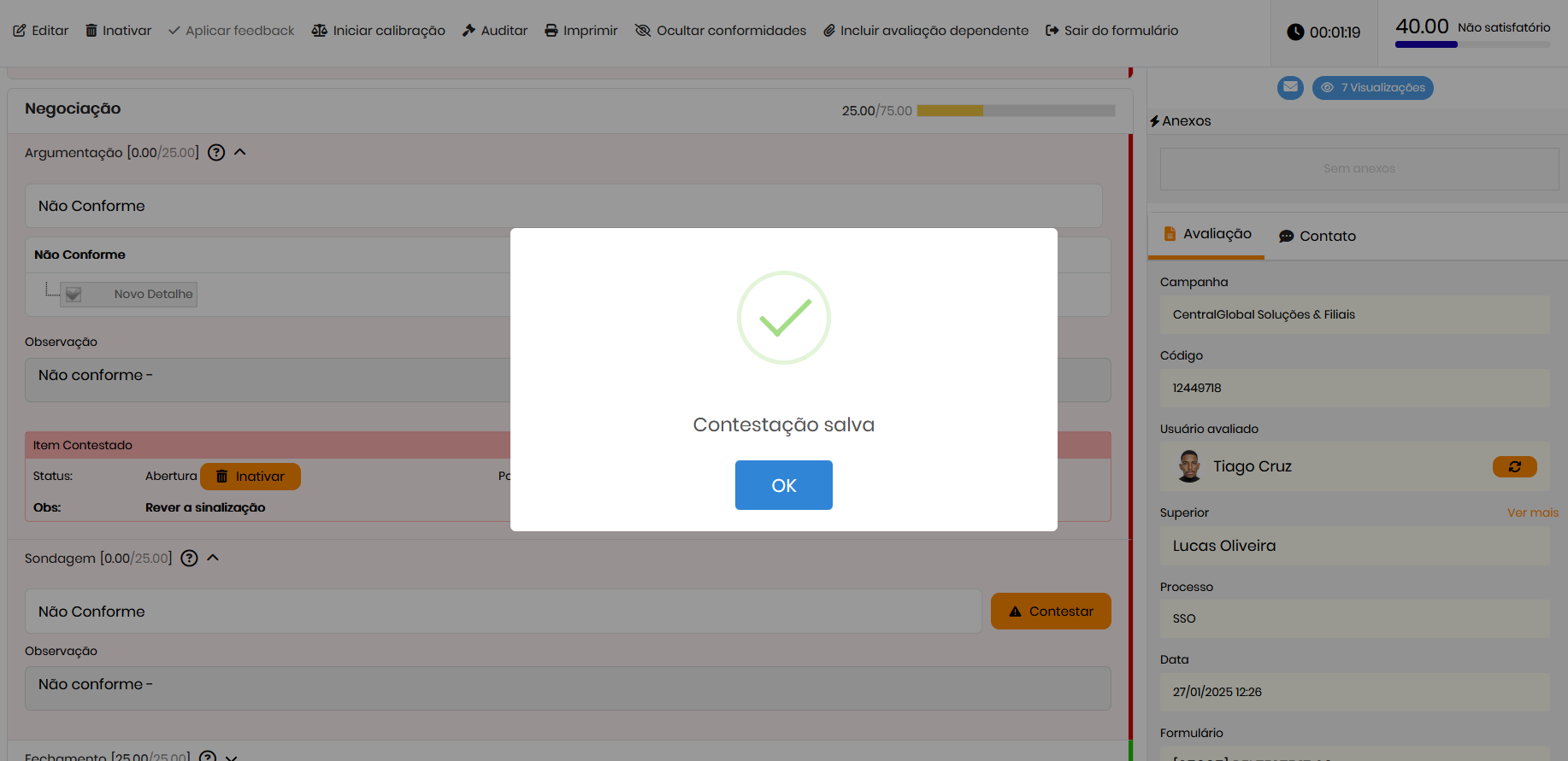 5. Insira a justificativa: Uma caixa de observação será aberta para que você preencha os argumentos da contestação. Caso deseje, também é possível incluir a minutagem do áudio para referência.