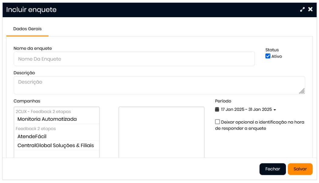 3. Após isso, a aba de "Dados Gerais" será habilitada para o preenchimento dos campos e definição das campanhas que responderão.