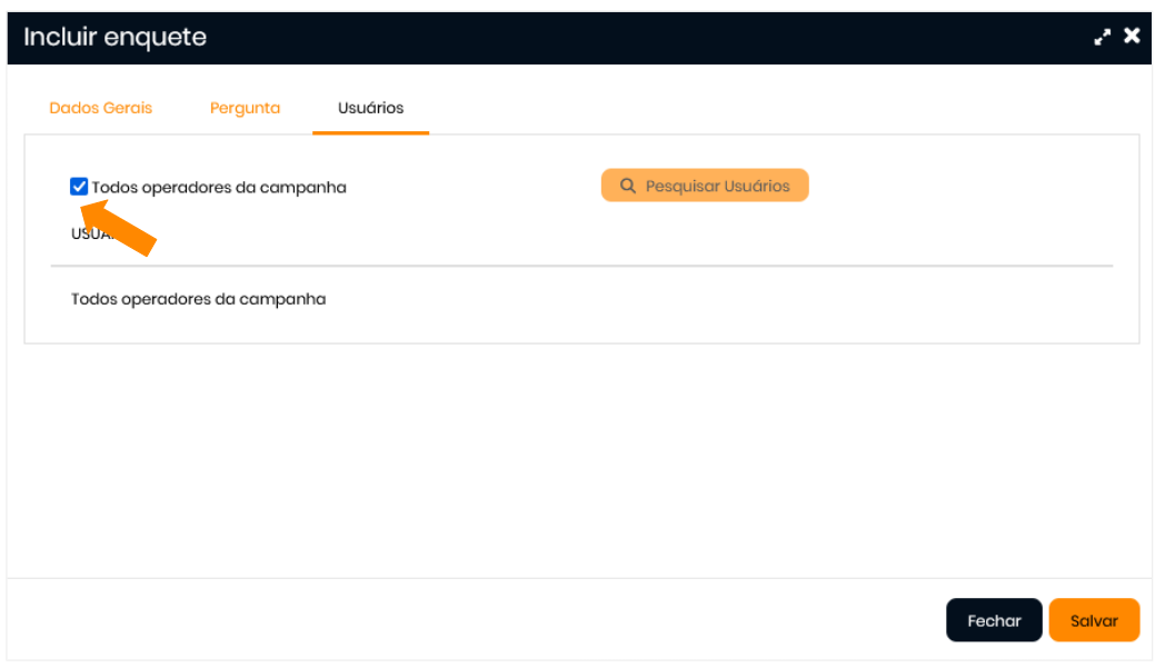 4.Clique em Salvar. Após salvar, as abas de Perguntas e Usuários serão habilitadas para a conclusão da enquete.