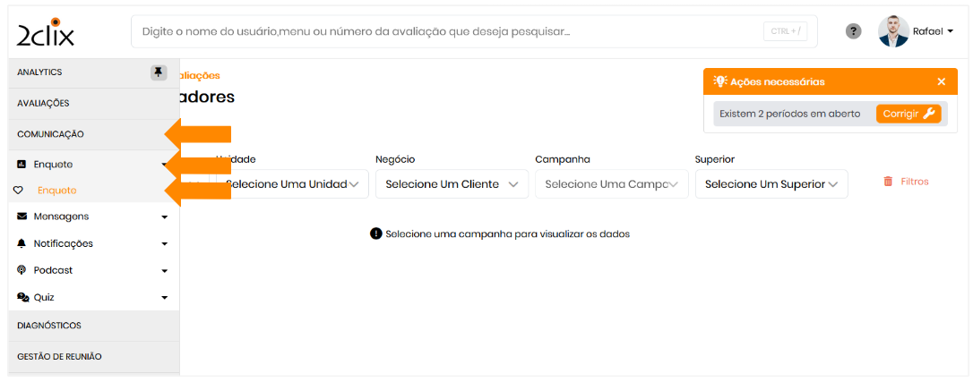 1. No menu lateral esquerdo, acesse: Comunicação>Enquete> Enquete.