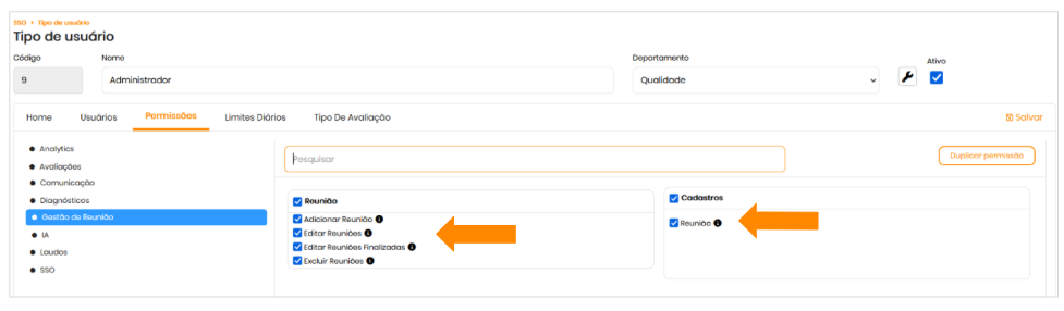 Para acessar os detalhes de uma reunião, o usuário precisa ter permissão para Reunião.