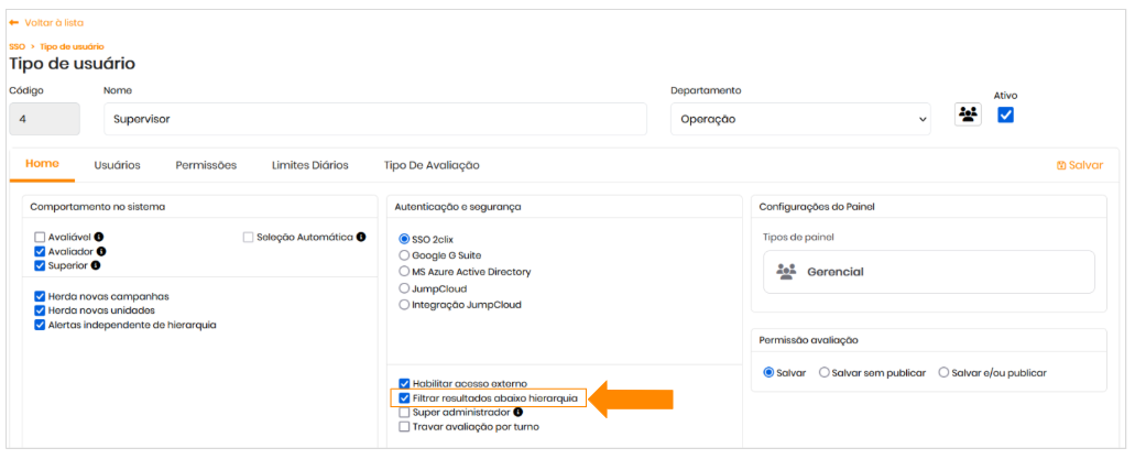 - Acesse o menu:SSO > Personalização > Permissões de Acesso