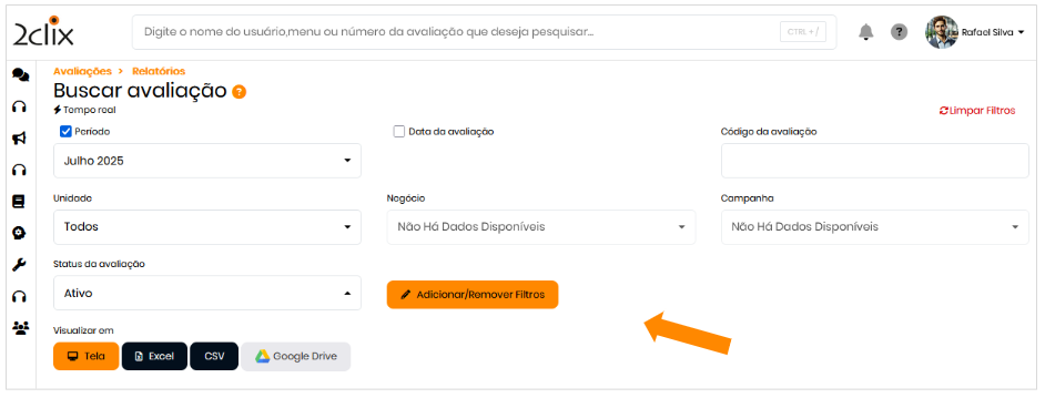 - Caso não tenha o código, utilize os demais filtros disponíveis para encontrar a avaliação desejada e clique em Tela para exibir os resultados.