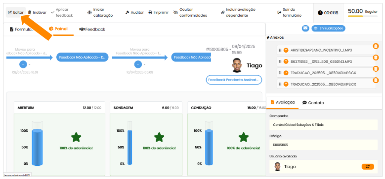 - Na tela da avaliação, acione o botão Editar na parte superior;