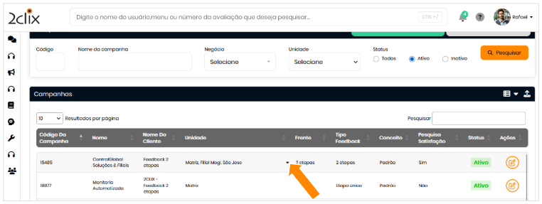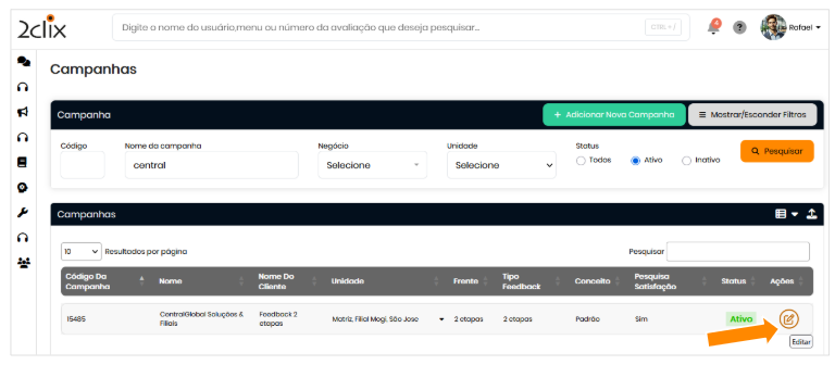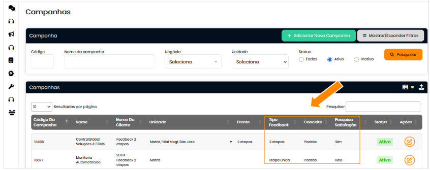 - Pesquisa de Satisfação: indica se a campanha possui pesquisa de feedback cadastrada.