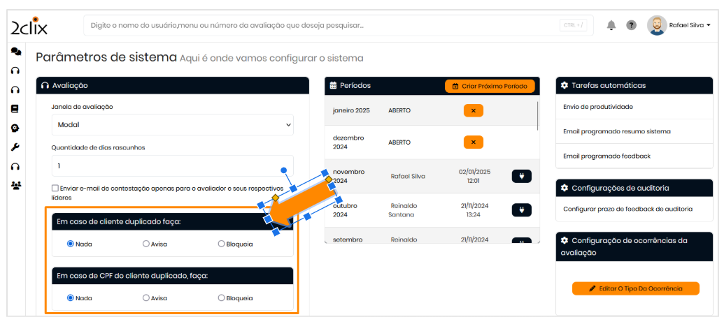 - Configuração de Parâmetros de Sistema: Na página Parâmetros de Sistema, localize a opção "Em caso de cliente duplicado faça:" ou "Em caso de CPF do cliente duplicado faça :" Escolha a configuração desejada e clique em "Salvar".