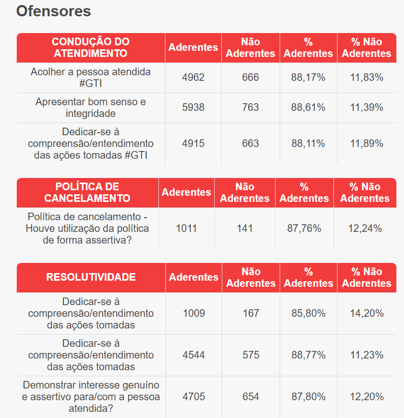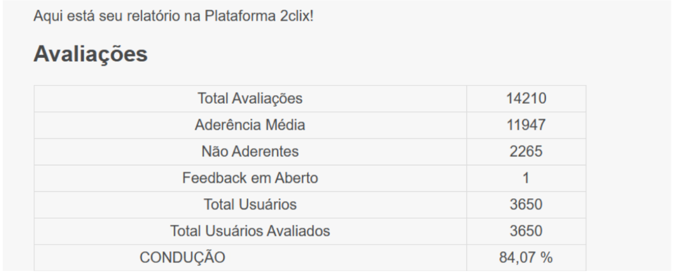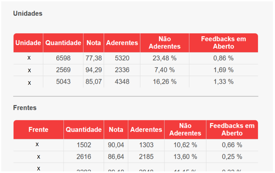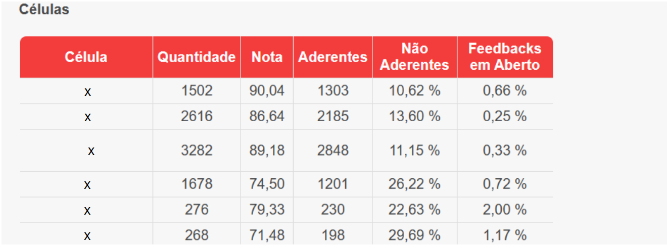 - As informações incluem: volume de avaliações, nota média, quantidade de aderências e não aderências, além do percentual de feedbacks em aberto.