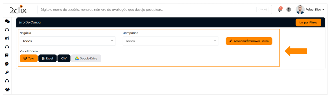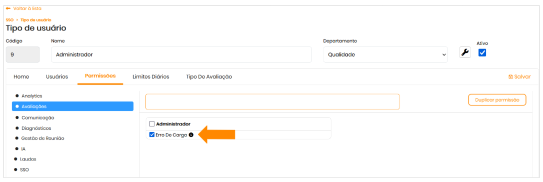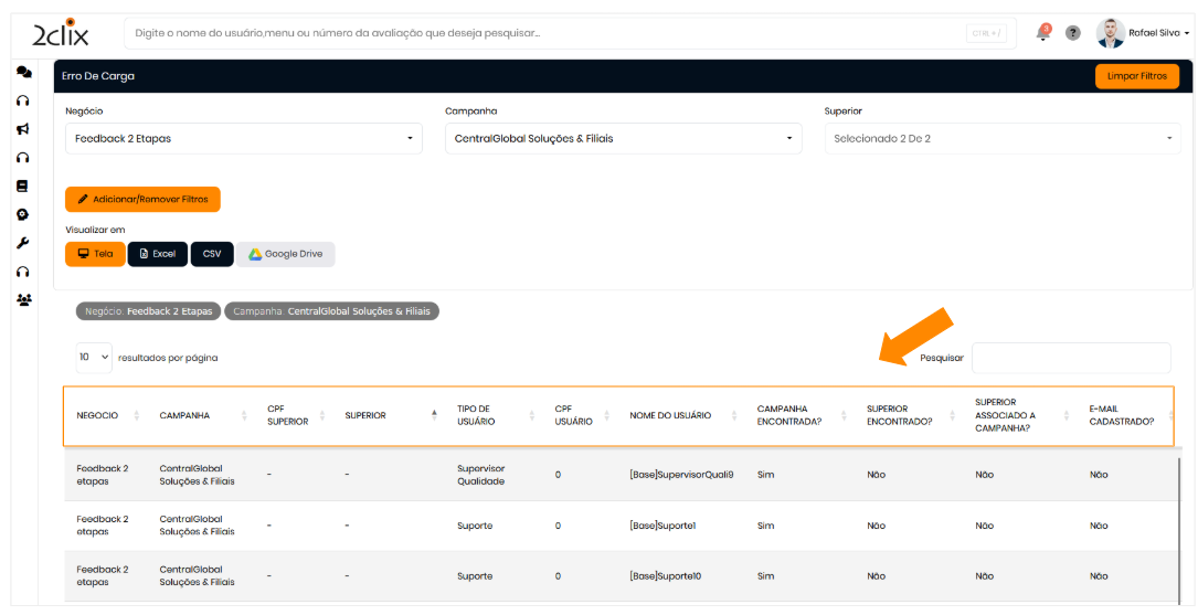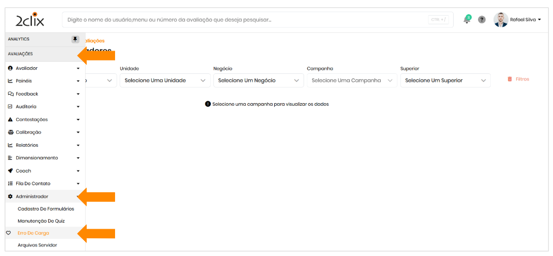 No menu lateral esquerdo, acesse: Avaliações > Administrador > Erro de Carga.