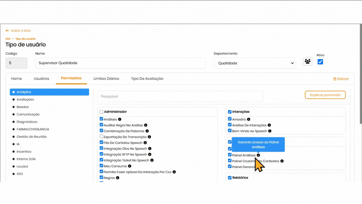 - Excluir Avaliação com Feedback: Caso a avaliação possua feedback aplicado, será necessário habilitar também a permissão Excluir Monitoria com Feedback .