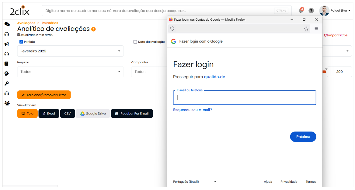 A plataforma permite que os relatórios sejam produzidos diretamente para o Google Drive , facilitando o acesso, compartilhamento e análise dos dados na nuvem.