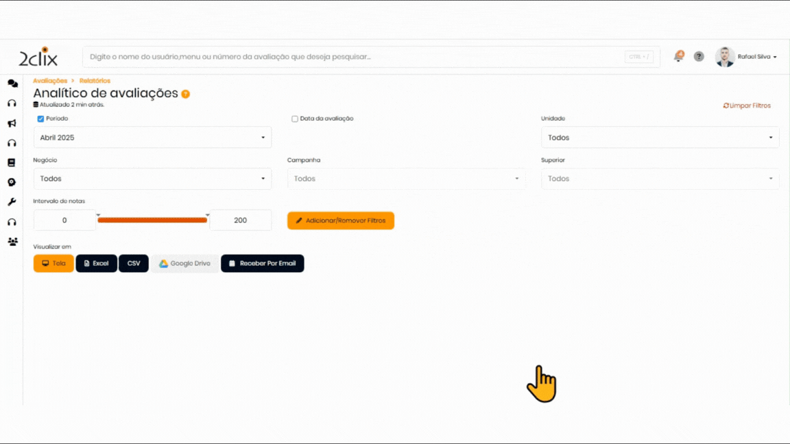 - Escolha do Formato de Exportação: Selecione o formato de exportação que atenda melhor às suas necessidades: Excel, CSV ,Google Drive ou Receber Por E-mail.