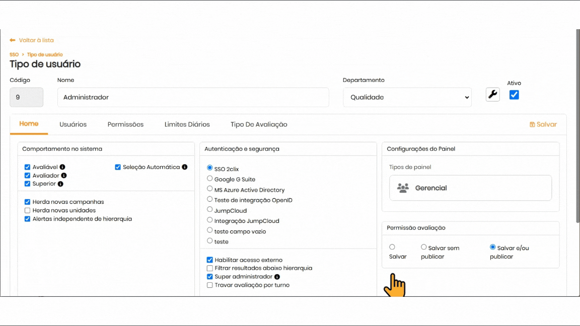Ao realizar uma avaliação, a aplicação de feedback geralmente fica disponível automaticamente. No entanto, a plataforma permite que o Administrador configure as permissões de acesso relacionadas ao feedback, atendendo às necessidades específicas de cada grupo de usuários.