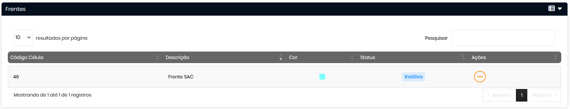 - Após confirmar, o status da frente será atualizado para Inativo , e ela deixará de ser exibida nos painéis e gráficos relacionados, mas ficarão registrados no histórico da plataforma para consultas futuras.