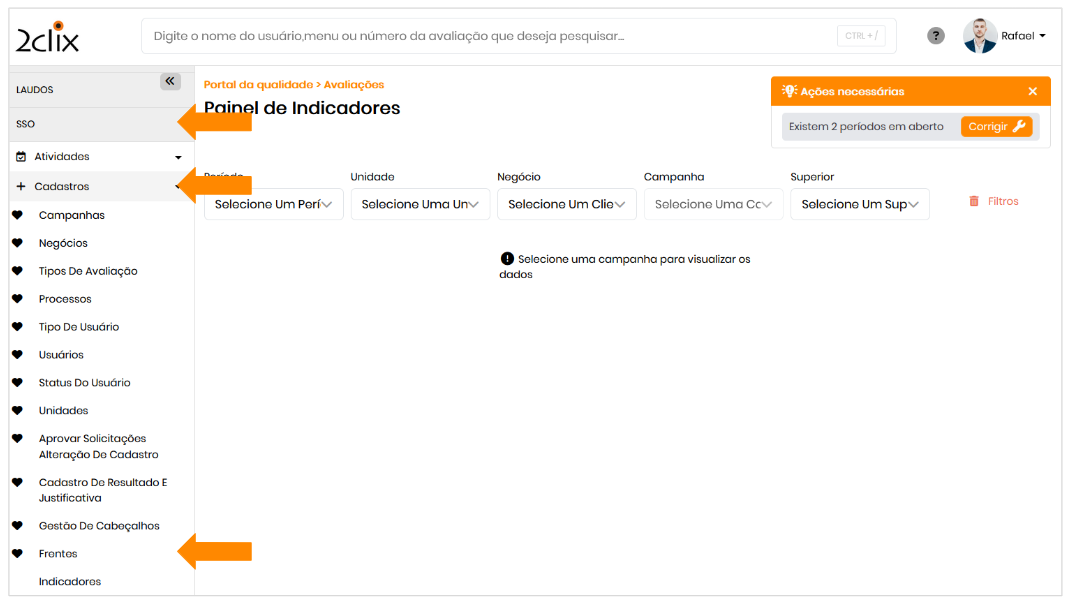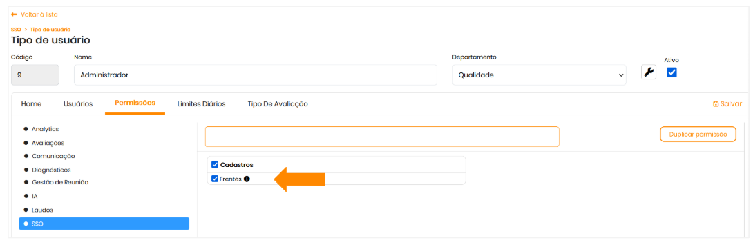 - No menu lateral da plataforma, clique em: SSO > Cadastro > Frentes .