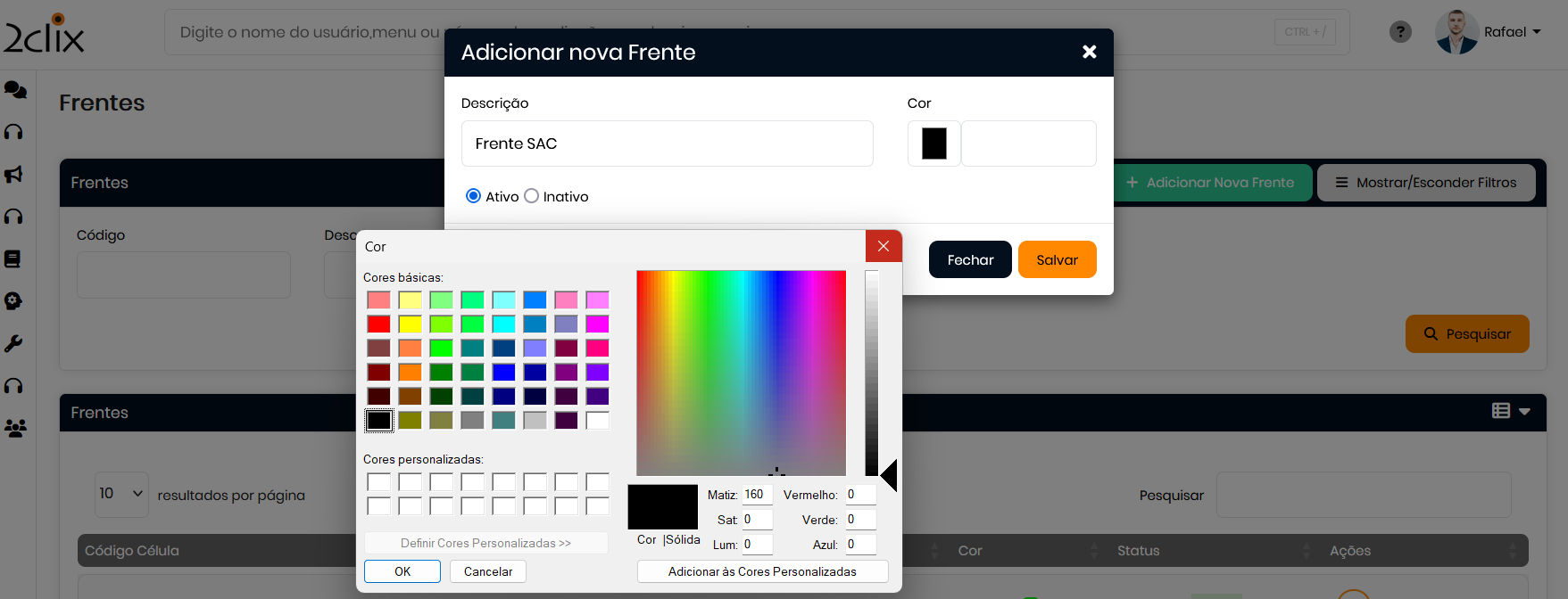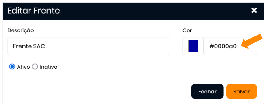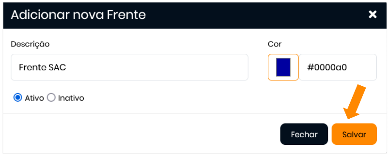 - No modal que será aberto, preencha os campos solicitados e escolha a cor desejada para a frente: