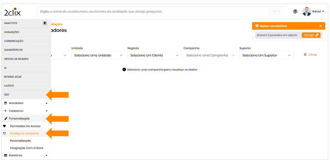 No menu lateral esquerdo, acesse: SSO > Personalização > Configurar Ambiente.