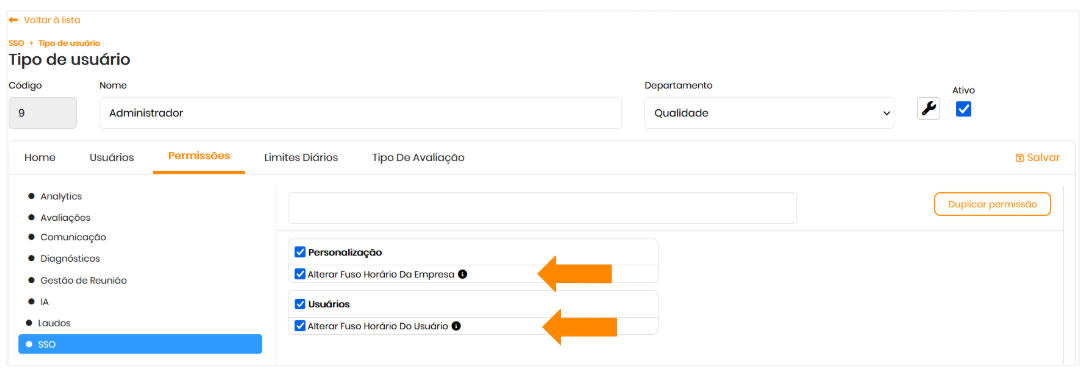 Para ajustar o fuso horário, os usuários precisam ter as seguintes permissões: