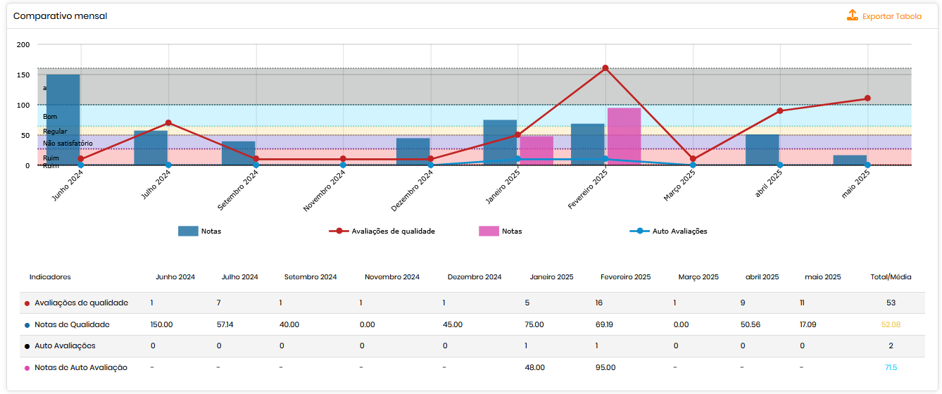 Apresenta o desempenho consolidado dos últimos 12 meses, com informações segmentadas por tipo de avaliação e média de notas. Inclui:
