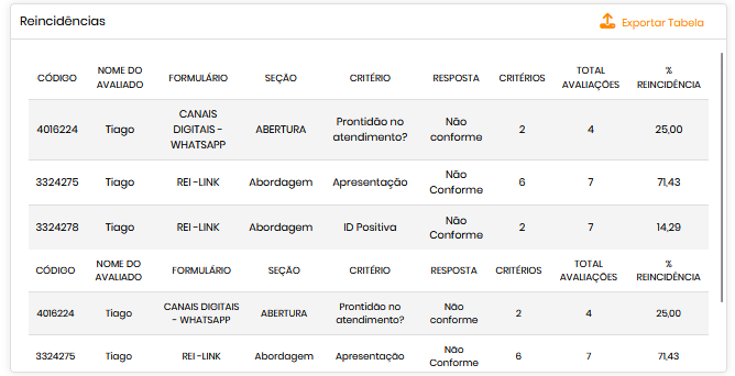 Apresenta, de forma consolidada, os critérios avaliados com maior ocorrência de não conformidades por usuário no período selecionado. Inclui: