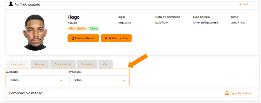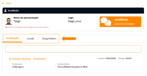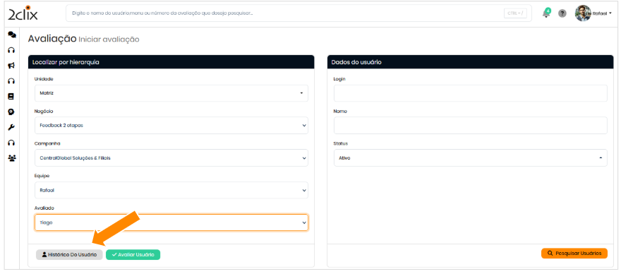 - Iniciar Avaliação: selecionar um usuário no menu de avaliação e acionar o botão de acesso ao Histórico Do Usuário.