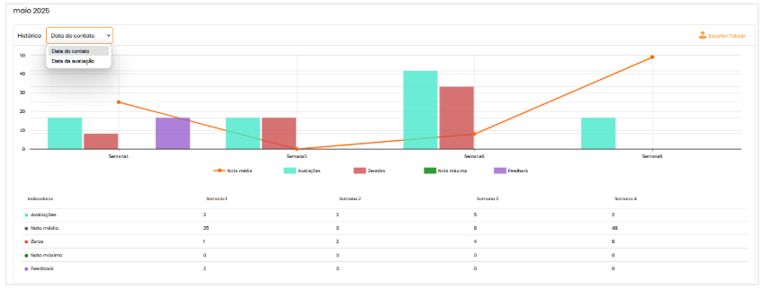 - Filtros por Data do Contato e Data da Avaliação ;