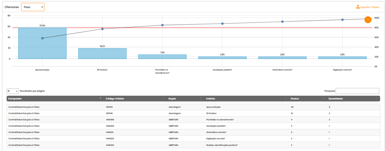 - Gráfico e tabela de itens ofensores do período selecionado;