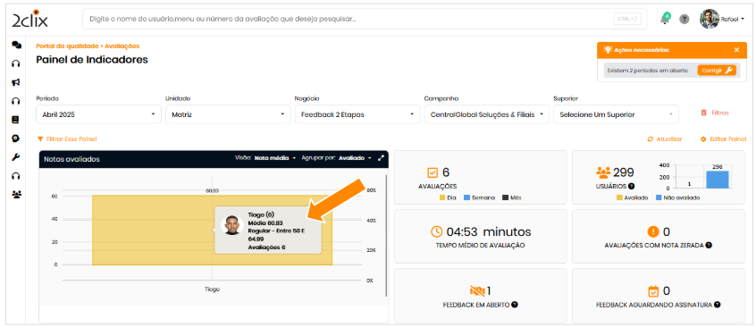 - Painel de Indicadores: nos gráficos do painel, clicar no nome de um usuário listado . Ao clicar em uma coluna do gráfico, será aberto um atalho para o histórico do usuário correspondente.