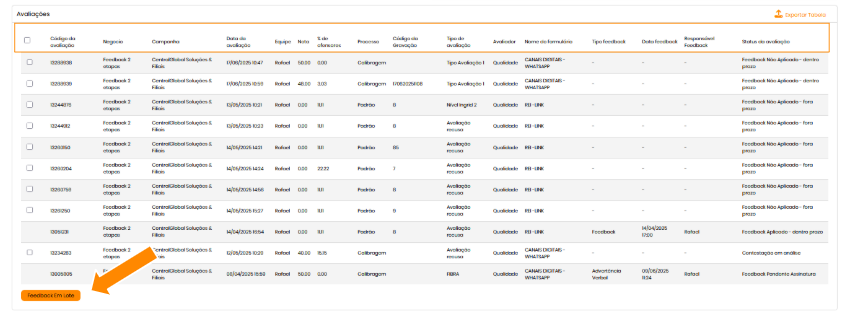 Caso o usuário possua permissão, o botão [Em lote] estará disponível, permitindo [aplicar feedbacks] ou [registrar justificativas] em lote.