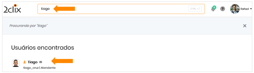 - Busca na plataforma: digitar o nome do usuário na barra de busca e clicar no nome do usuário listado;
