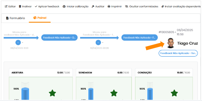 Dentro do Formulário de Avaliação: acionar nome do colaborador exibido no formulário será aberto o histórico do usuário.