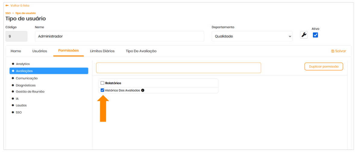 Para acessar o histórico do usuário, é necessário da permissão: