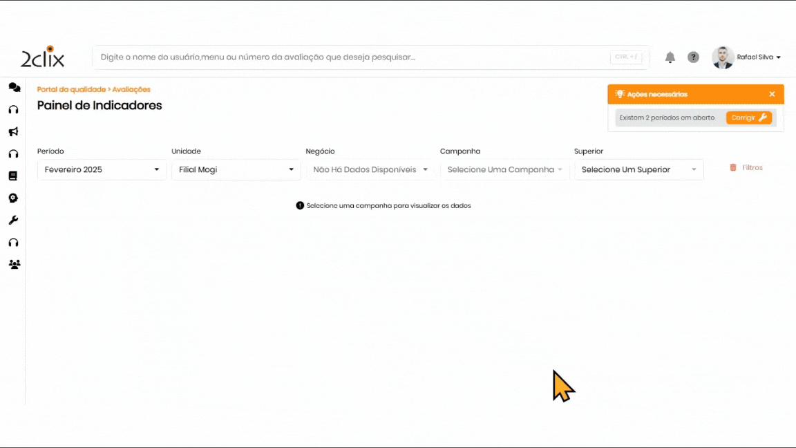 Painel Gerencial: Sem gráficos de notas dos agentes, clique em um dos usuários selecionados.