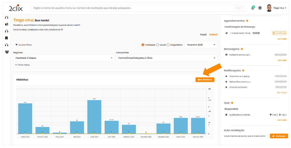 No Painel Indicadores , há um gráfico que mostra o histórico de notas dos últimos 12 meses. Para obter mais detalhes, clique na opção "Meu Histórico" .
